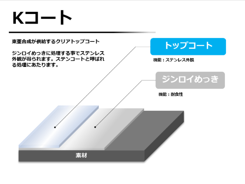 ニッケルめっき、三価クロメート(白)など、美観や適度な防錆力が重視されます。 - 屋外・塩害地域: