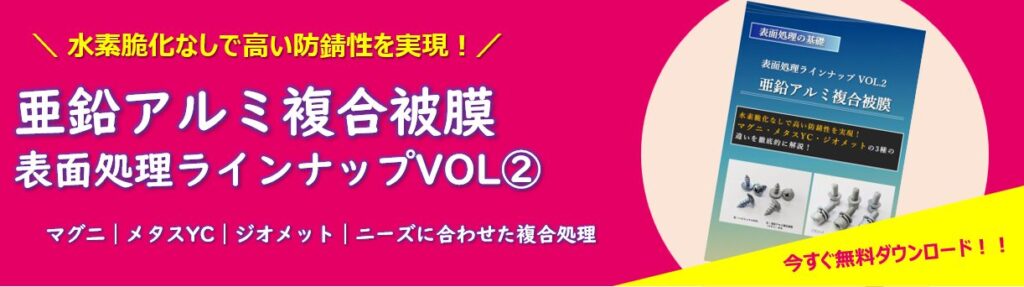 ジオメット処理は焼付け工程によるコーティングであり、水素脆性のリスクがありません。これは、ネジやボルトといった締結部品にとって重要な特長です。従来の電気亜鉛めっきでは水素脆性が発生する可能性がありましたが、ジオメット処理ではその心配がなく、耐久性と防錆性を両立した処理が可能です。